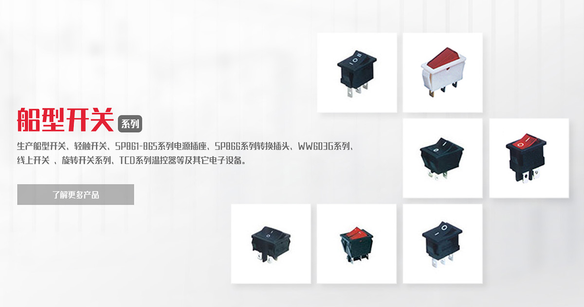 公司專業(yè)生產(chǎn)船型開關、輕觸開關、SP861-865系列電源插座、SP866系列轉換插頭、WW11系列微動開關、WW01-03、09系列按鈕開關DS、WW系列指示燈開關、WW603G系列 線上開關 、旋轉開關系列、TCD系列溫控器等及其它電子設備。